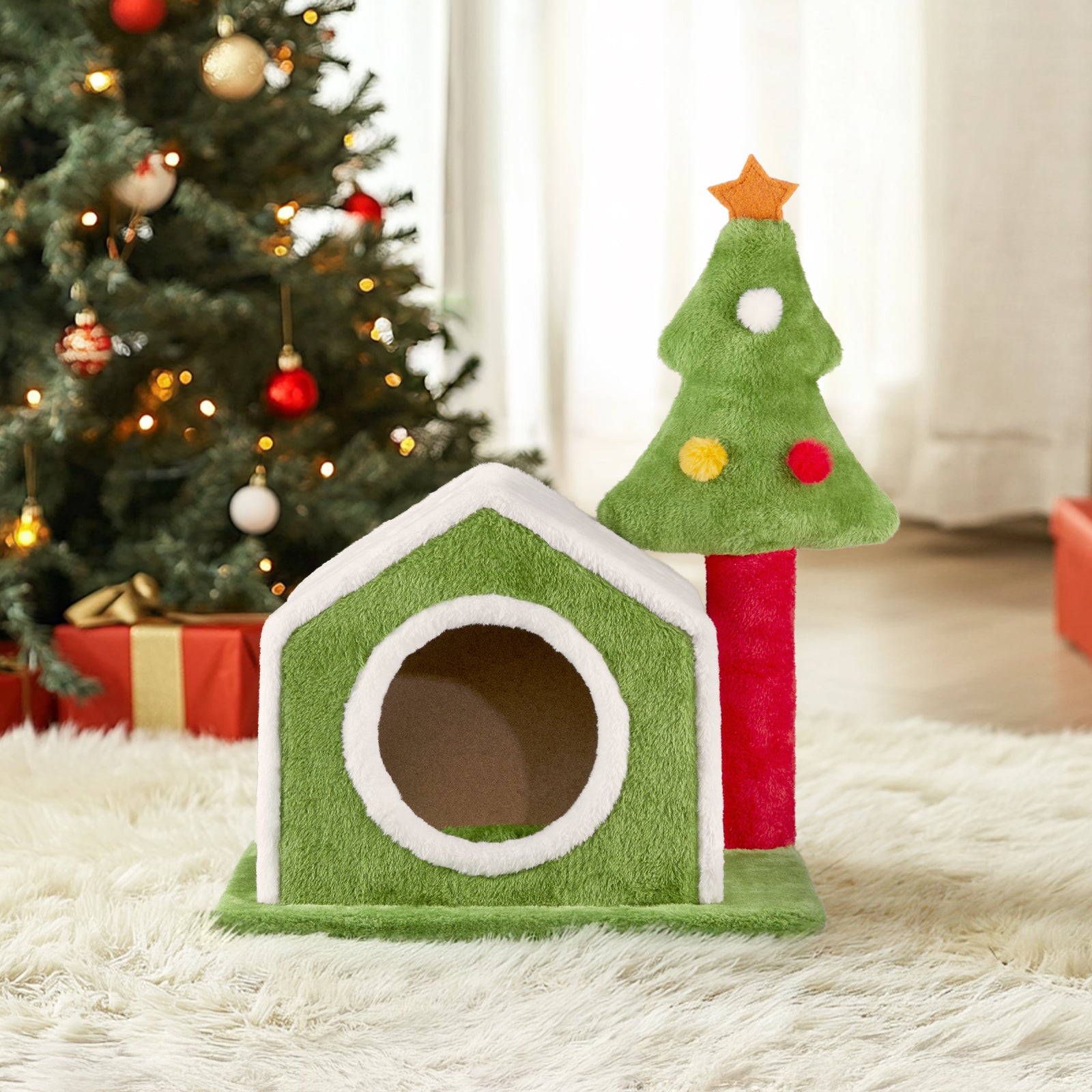 1. Festive Christmas Design: Featuring festive colors and a cute plush Christmas tree, this cat house serves as both a cozy bed for your cat and an adorable holiday decoration, inviting your furry friend to be part of the seasonal fun.