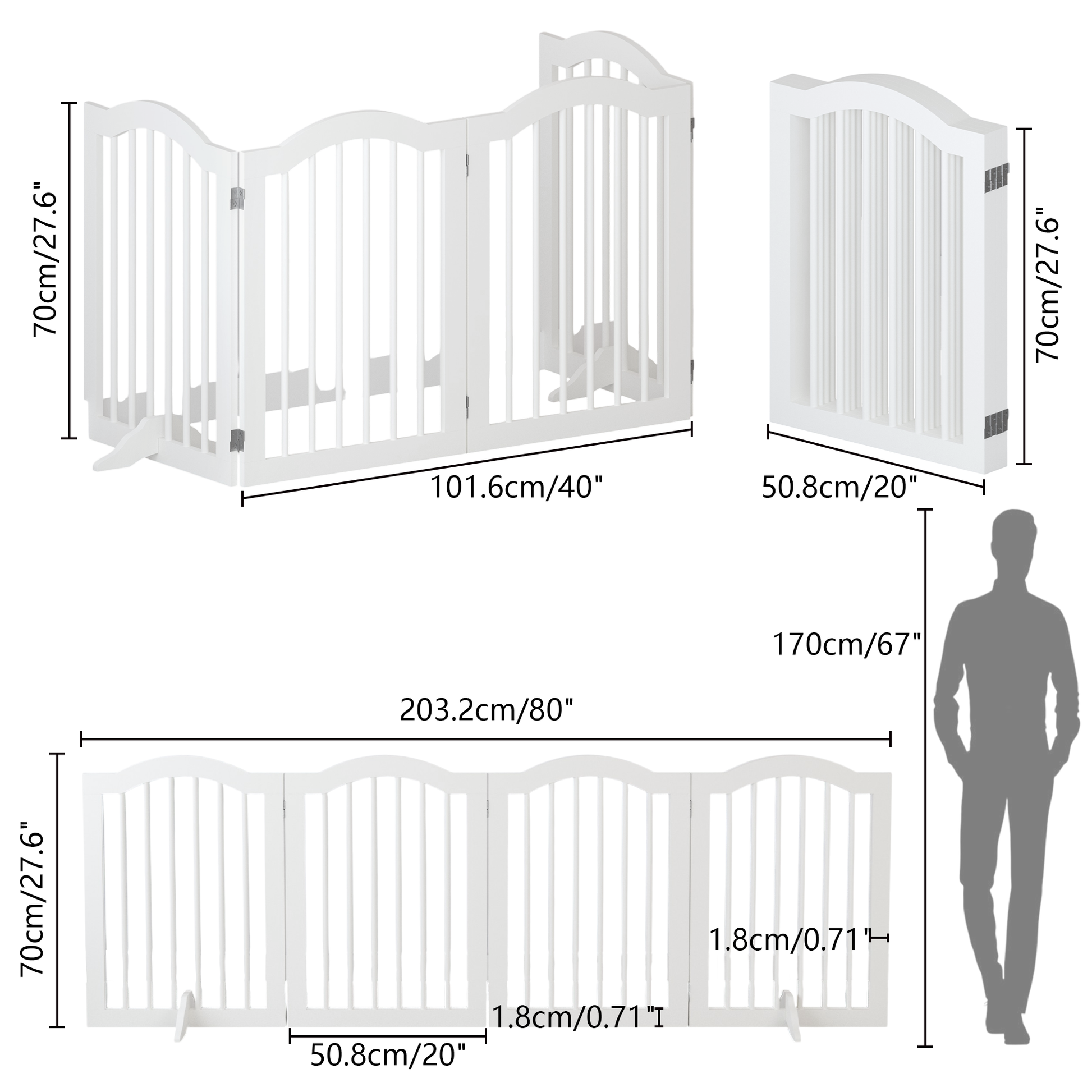 - 4-Panel Pet Gate: Constructed from 0.7″ thickened MDF boards composing a durable wooden frame, this 4-panel pet fence stands 27.6 inches tall, ensuring durability and security for your pets. Also, its width can expand to a maximum of 80 inches, adapting to various shapes based on user needs