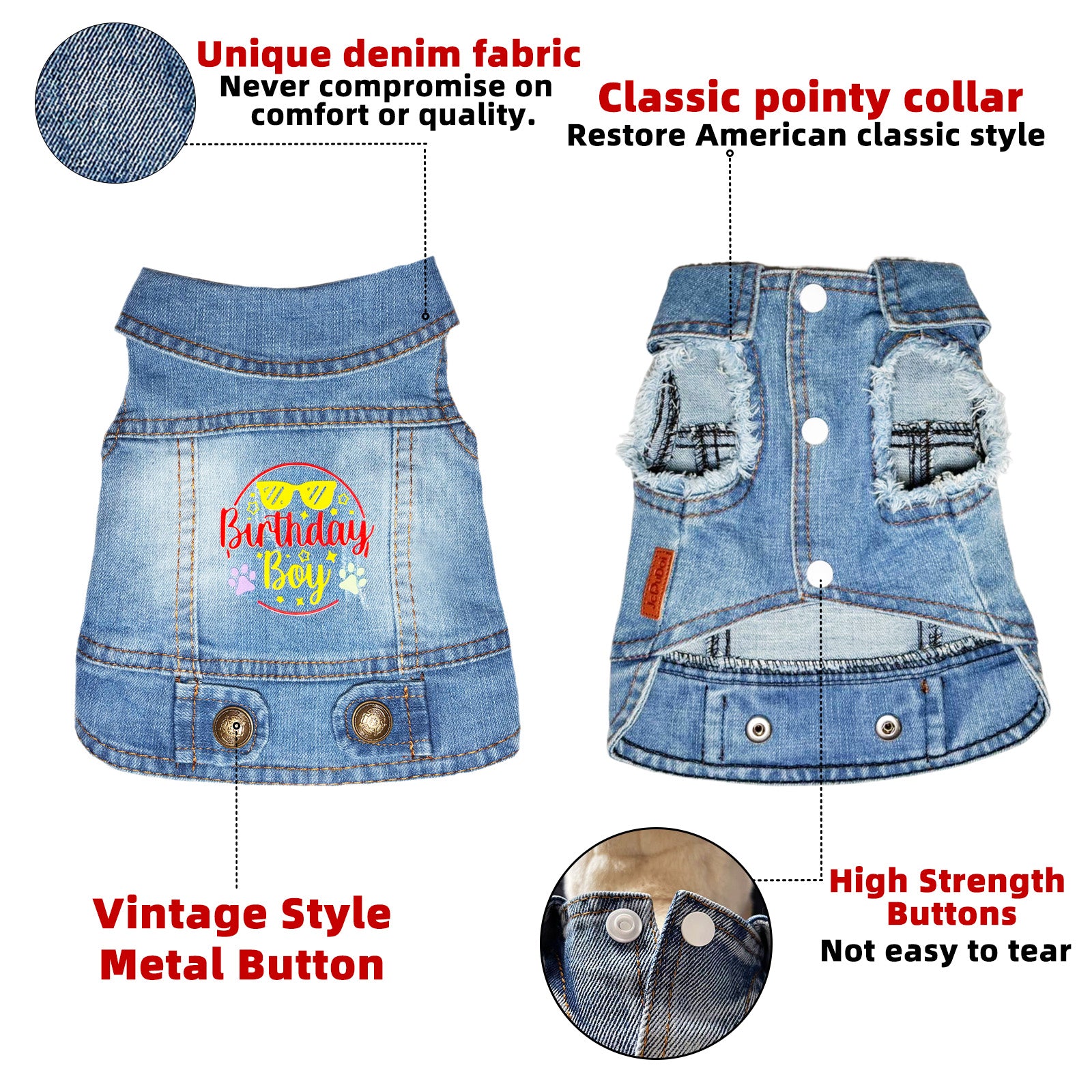 - The Birthday-themed Denim Jacket is adorned with a unique printed font, adding a creative touch to your pet's special day. It's also a great gift for other birthday boys.
