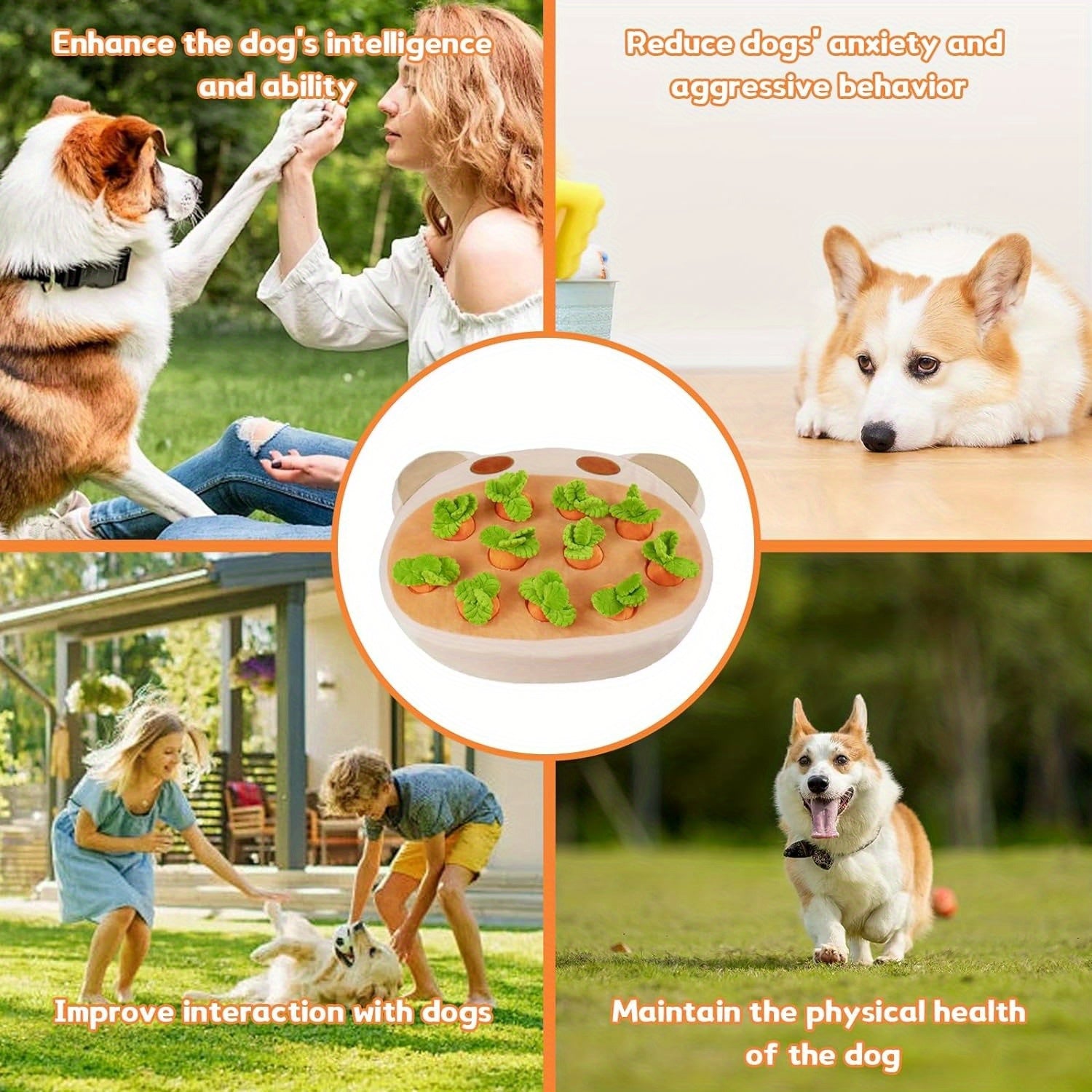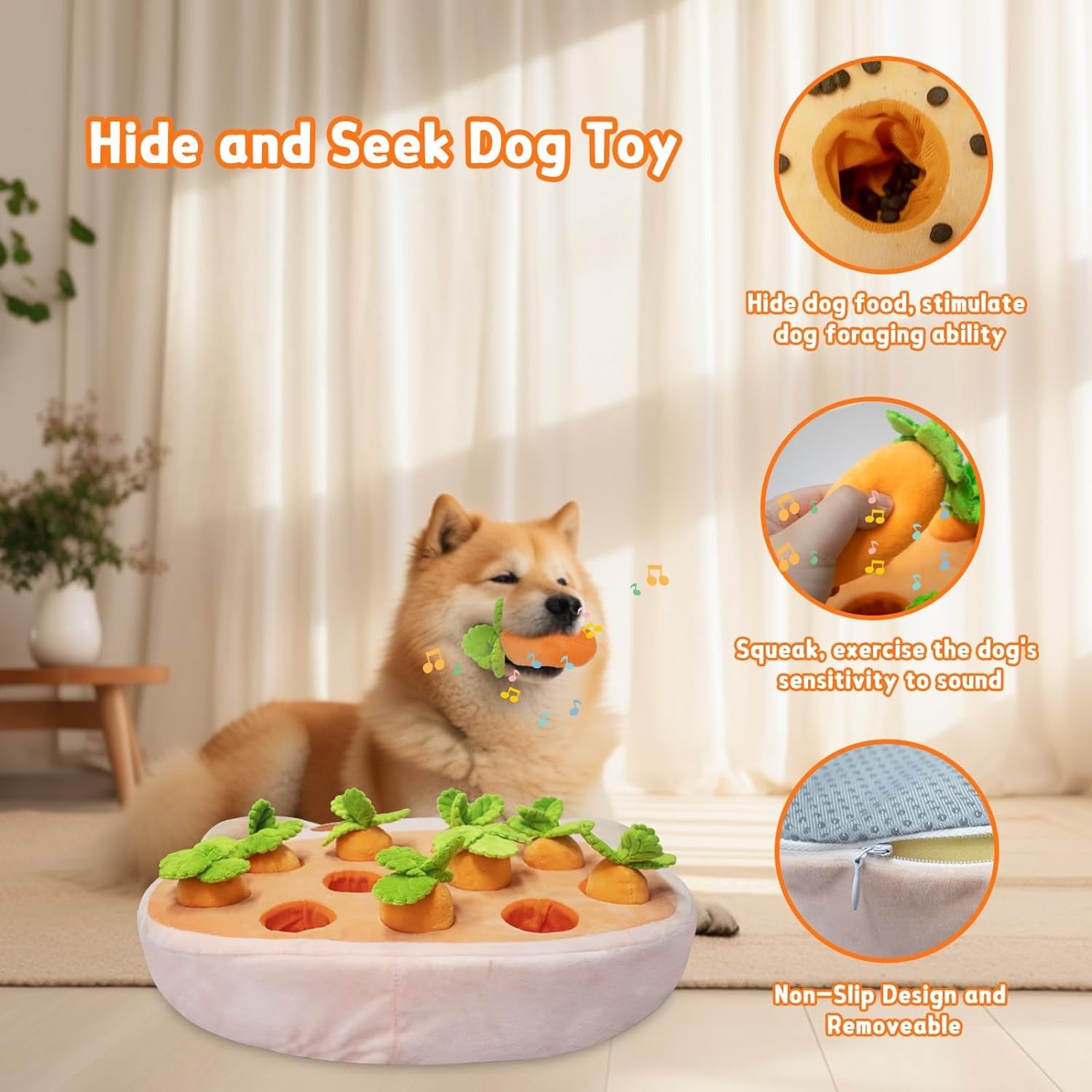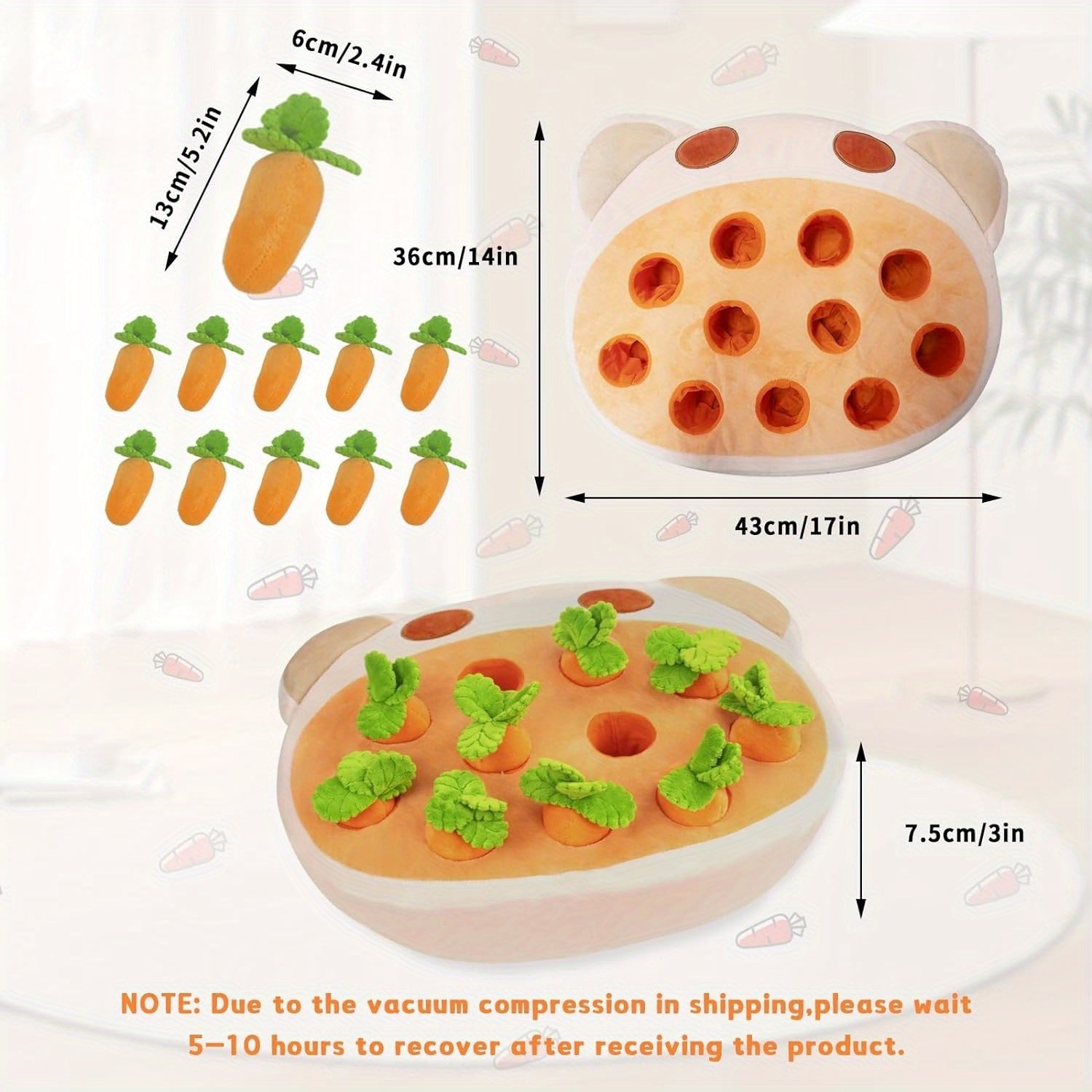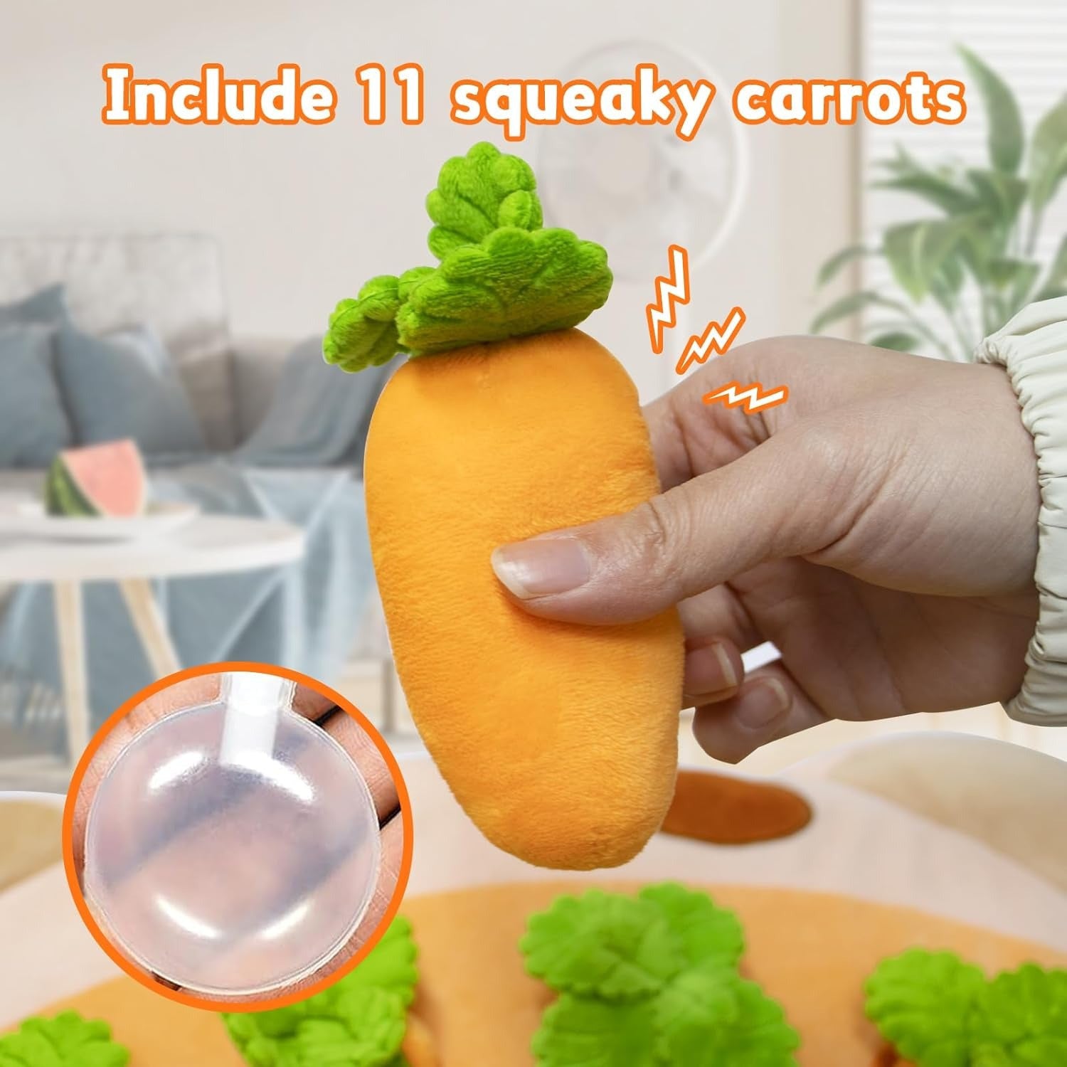 Gently pull out the squeaky carrots and create an enticing hiding spot for treats underneath!